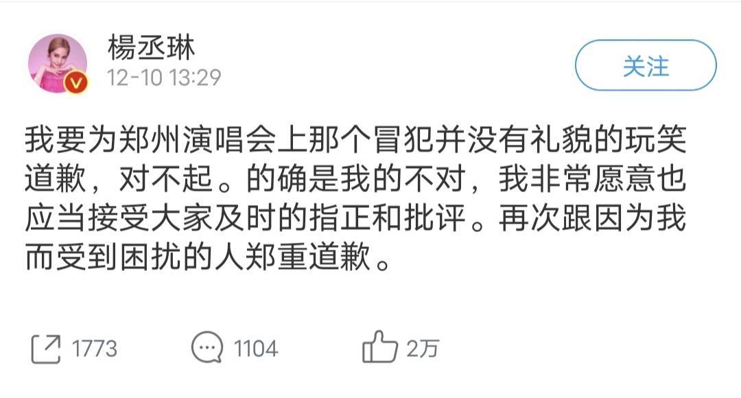 面对舆论压力,杨丞琳于12月10日中午在个人微博发文道歉:我要为郑州演唱会上那个冒犯并没有礼貌的玩笑道歉,对不起。的确是我的不对,我非常愿意也应当接受大家及时的指正和批评。再次跟因为我而受到困扰的人郑重道歉。